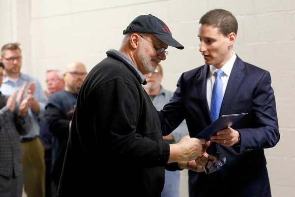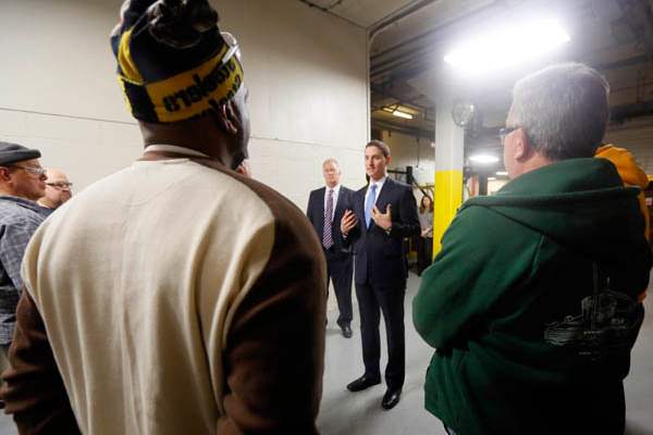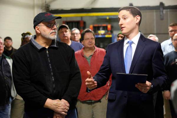 Ohio Treasurer Josh Mandel, center, speaks with employees of Toledo Metal Spinning after handing out the first "Ohio Strong" award Monday.