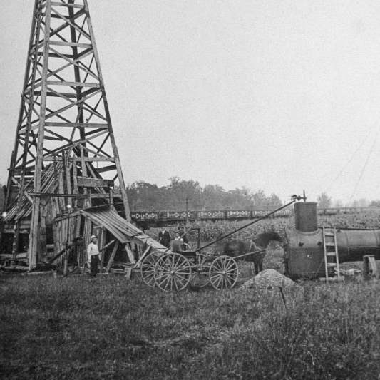 A horse-drawn cart is seen at an oil well at Bradner, Ohio, as a train passes in the background.
