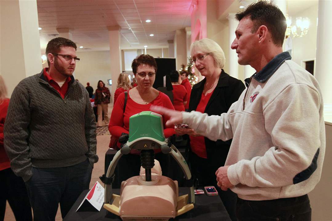 From left: Cory Panning, Jami Zeltner and Mercy College's Vickie Delaney listen to Lt. Steve Kahan demonstrate tools of the trade during the Go Red Lunch.