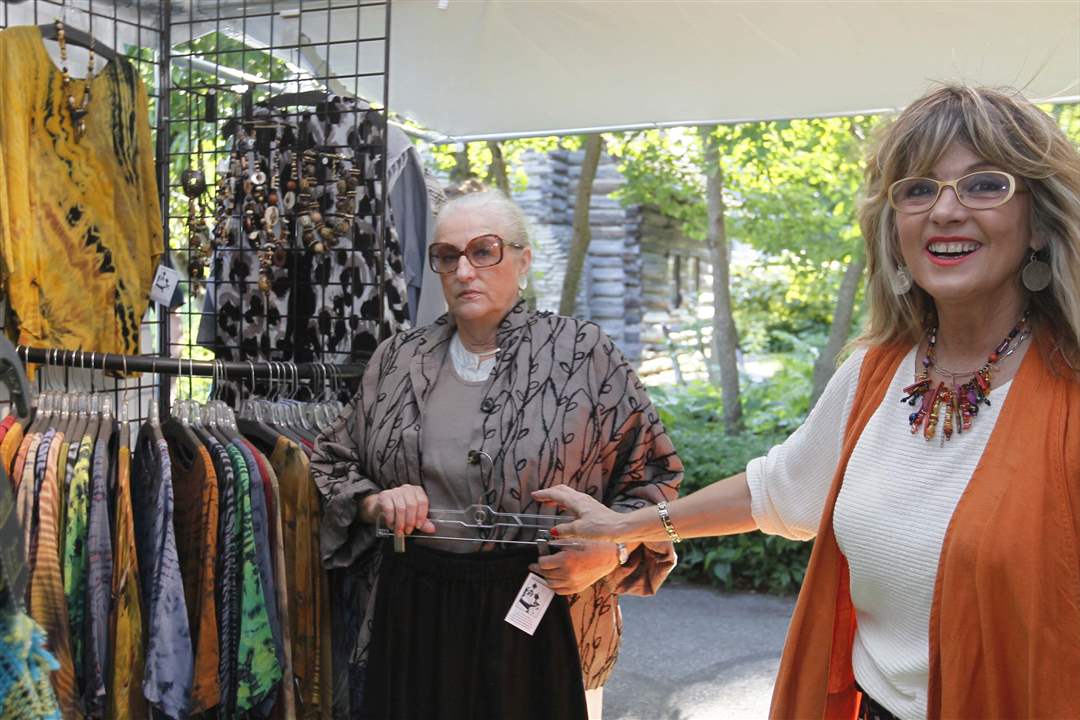 Rosalee Heyman, of Maumee, left, tries on clothes created by Marijke Benedict, of Allenwood, Pa., at the Preview Gala for the 49th Annual Crosby Festival of the Arts in Toledo.