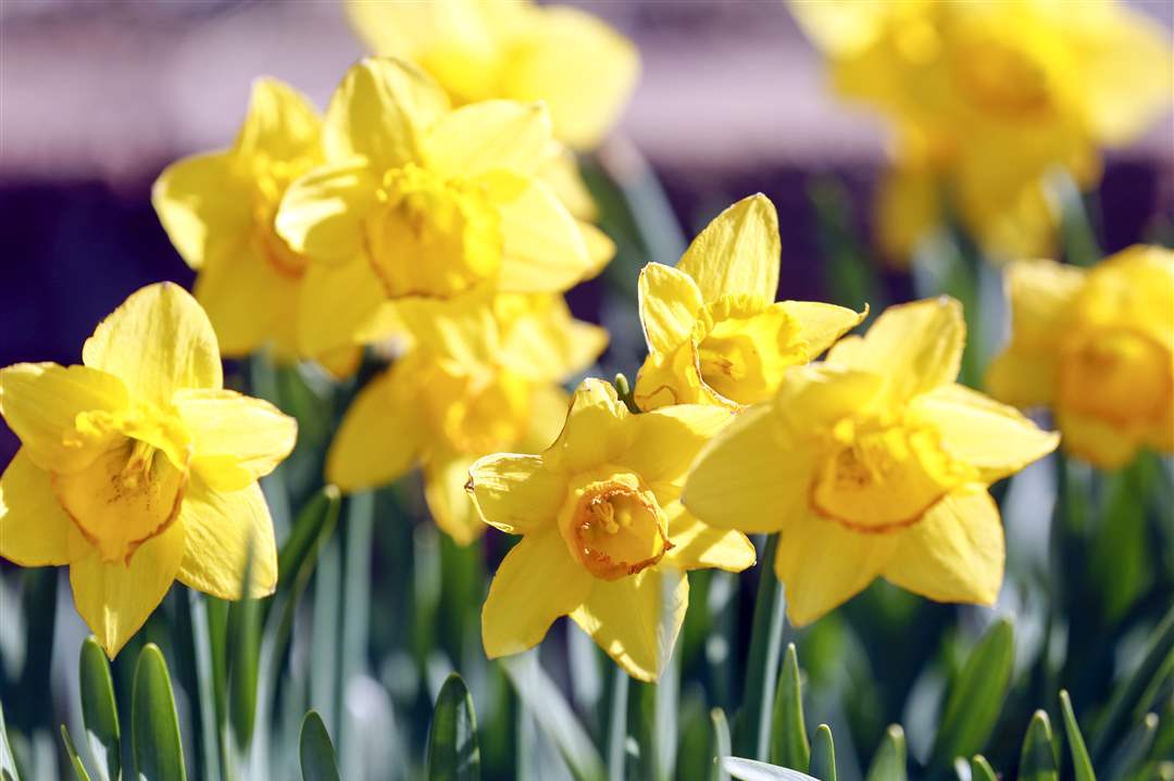 Blooming yellow flowers bow in the wind in front One Government Center on April 21, 2015.