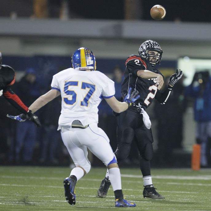 McComb High School quarterback Dalton Buck, 2, throws the ball over Delphos St. John's player Kody White, 57.