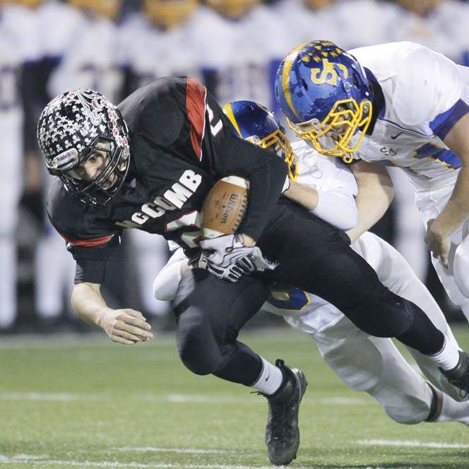 McComb High School player Dalton Buck, 2, is tackled by Delphos St. John's players Will Buettner, 81, and Cody Looser, 11.