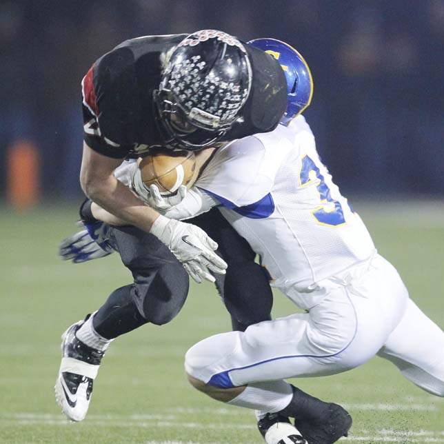 McComb High School player Jerry Brown, 23, is hit behind the line of scrimmage by Delphos St. John's player Ben Youngpeter, 31.