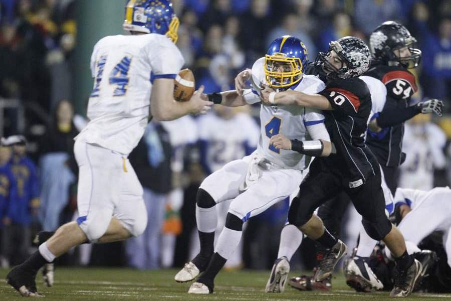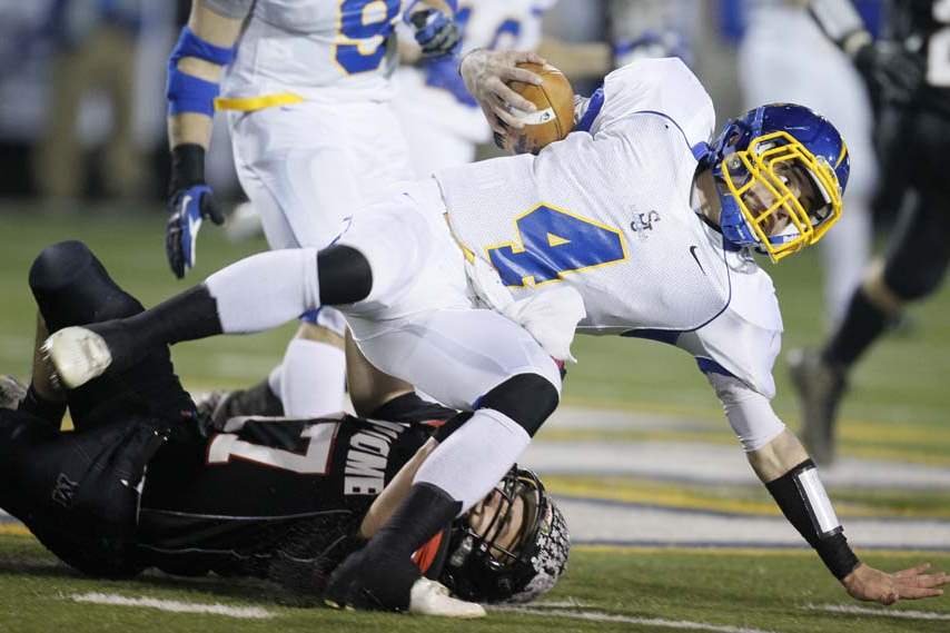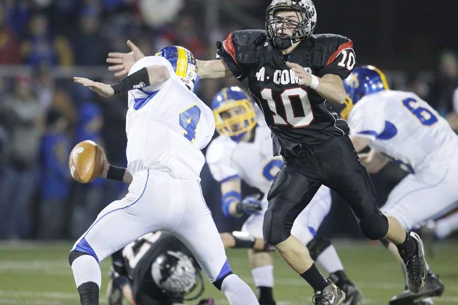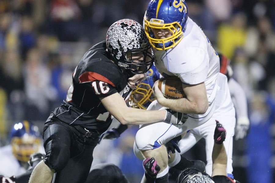 McComb High School player Michael Jones, 21, sacks Delphos St. John's quarterback Mark Boggs, 4.
