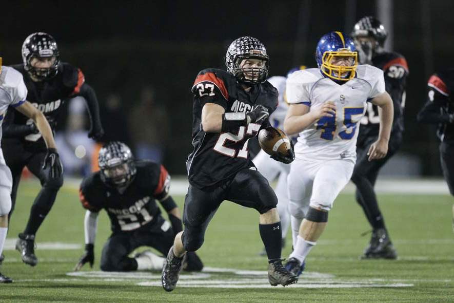 McComb High School player Cody Wilson, 27, out runs the Delphos St. John's defense to score a touchdown.