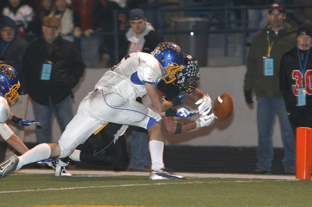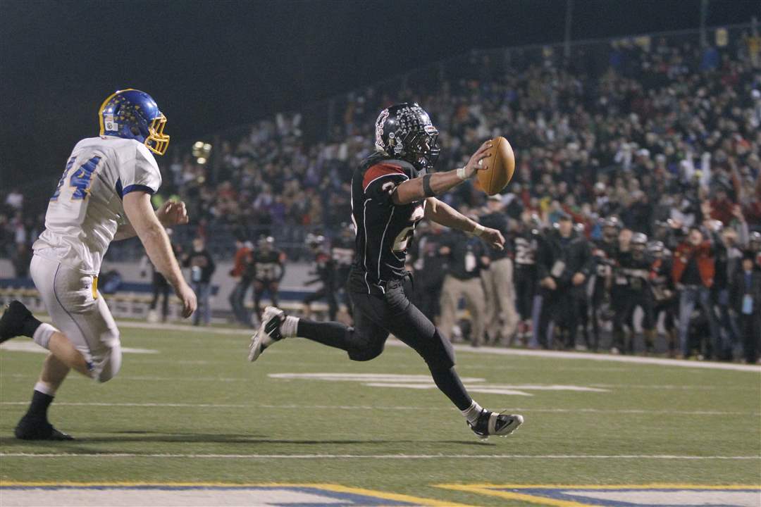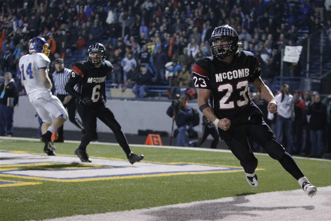 McComb High School player Jerry Brown, 23, beats Delphos St. John's player Tyler Jettinghoff, 14, to the end zone for the winning touchdown.