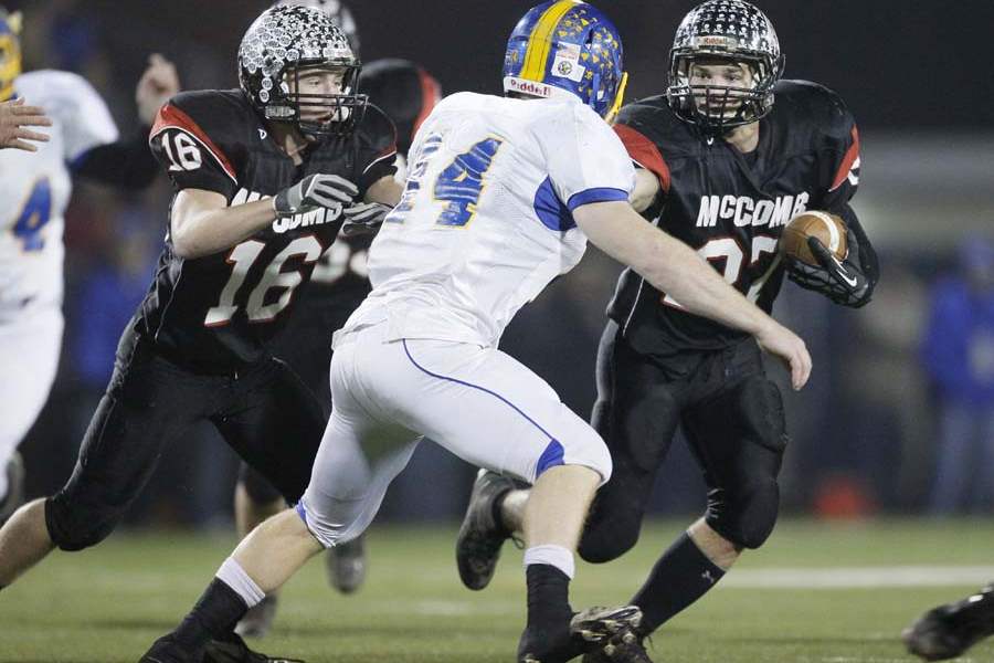 McComb High School player Cody Wilson, 27, has help as teammate Mitch Schroeder, 16, blocks Delphos St. John's player Tyler Jettinghoff, 14.
