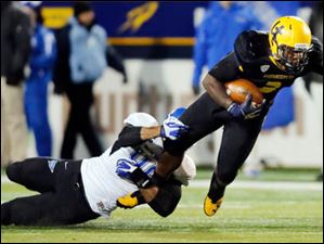 Buffalo RB Branden Oliver (3) is stopped by University of Toledo DE Christian Smith (9) during the second quarter.