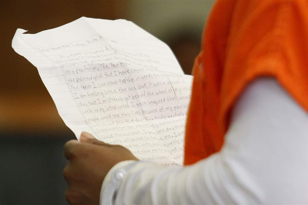 Sharnell Owens, 34, reads a letter to the families of the victims during her sentencing on two counts of aggravated vehicular homicide.