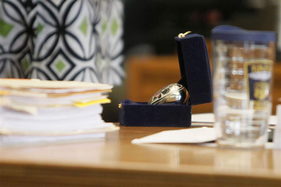 The ashes of victim Terry Traver rest on a table as Melissa Traver, daughter of victim Terry Traver, speaks during the sentencing of Sharnell Owens.