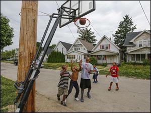 From left, Travares Craig, 10, Trezon Manns, 10, Broderick Goodlow, 14, his cousin Raymond Goodlow, 6, and Terrance Coffey, 9, play basketball in front of a vacant home in the 600 block of Ashwood Avenue.