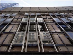 Broken windows at the Madison Building (Nasby Building) at the intersection of Huron Street and Madison Street.