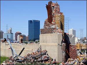 The downtown Toledo skyline is visible behind the remains of the Toledo Edison Acme power plant in the Marina District.