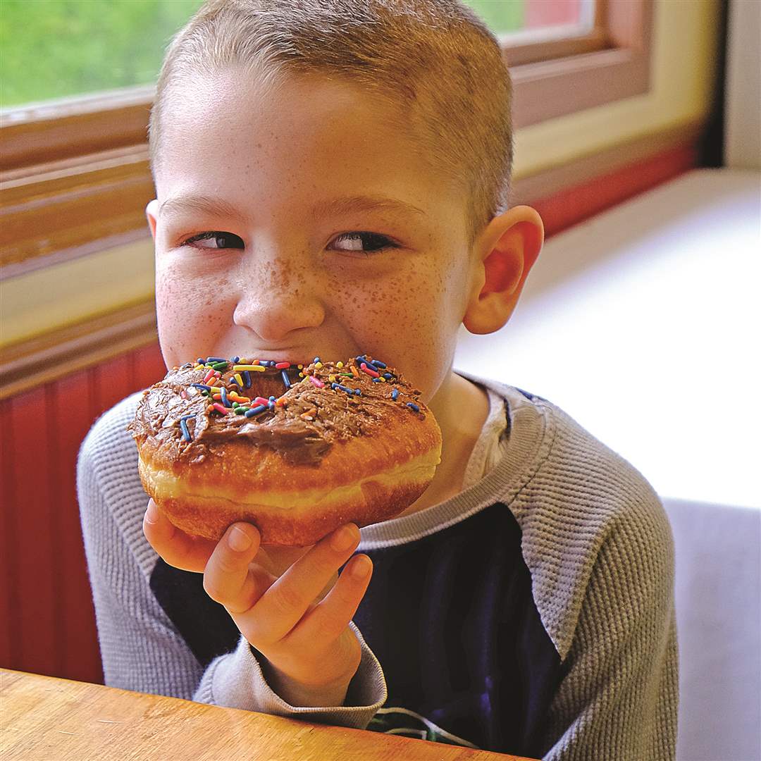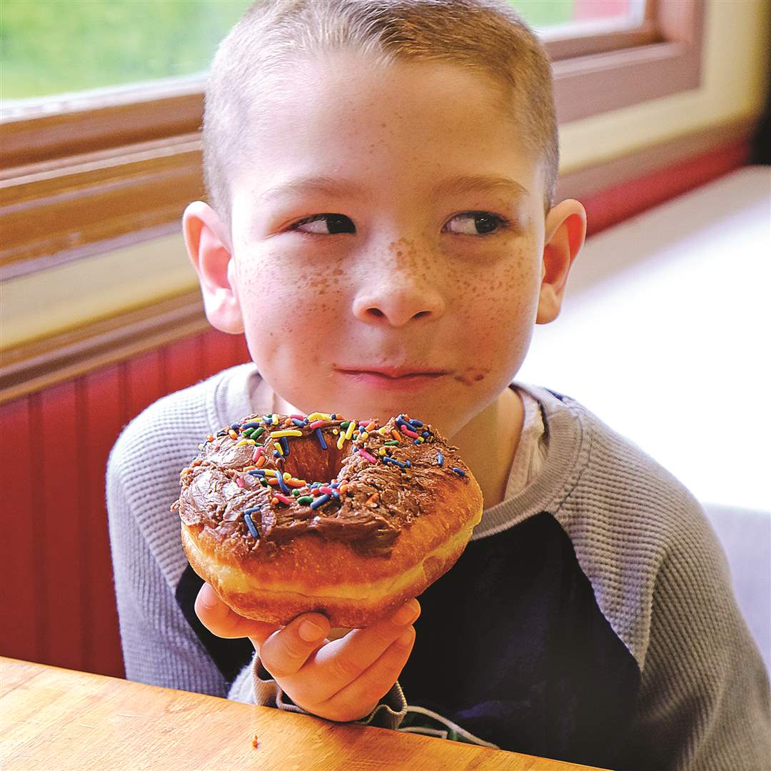 John Paul Hetz, III, 6, of Toledo, eating a chocolate covered doughnut with sprinkles at Haas Bakery.