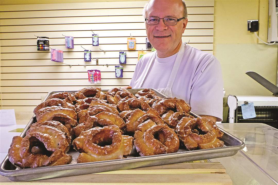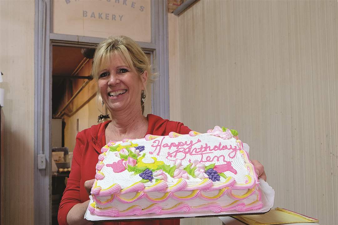 Bonnie Brieschke and a decorated doughnut cake at Brieschke's Bakery in Sylvania.