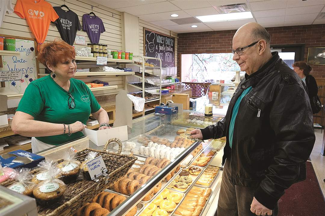 Judi Bloomfield takes an order from Tom LeBowsky at Wixey Bakery.