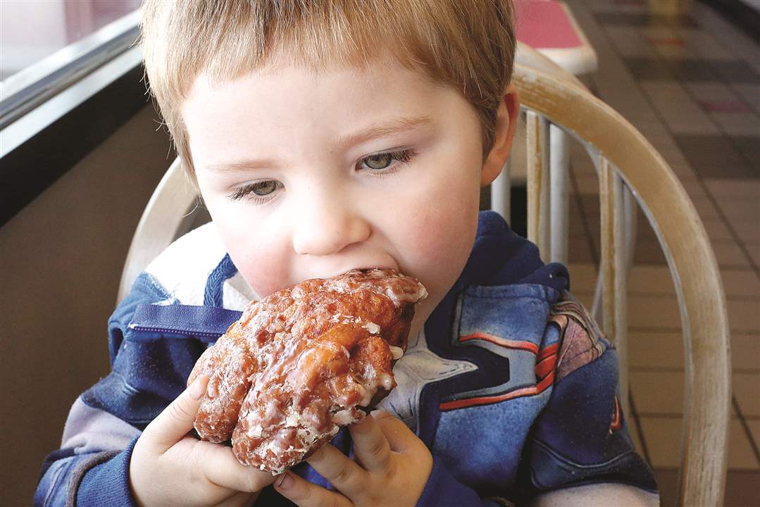Thomas Booze, 2, bites into a Apple Fritter at Cafe Donuts.