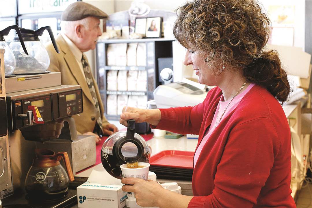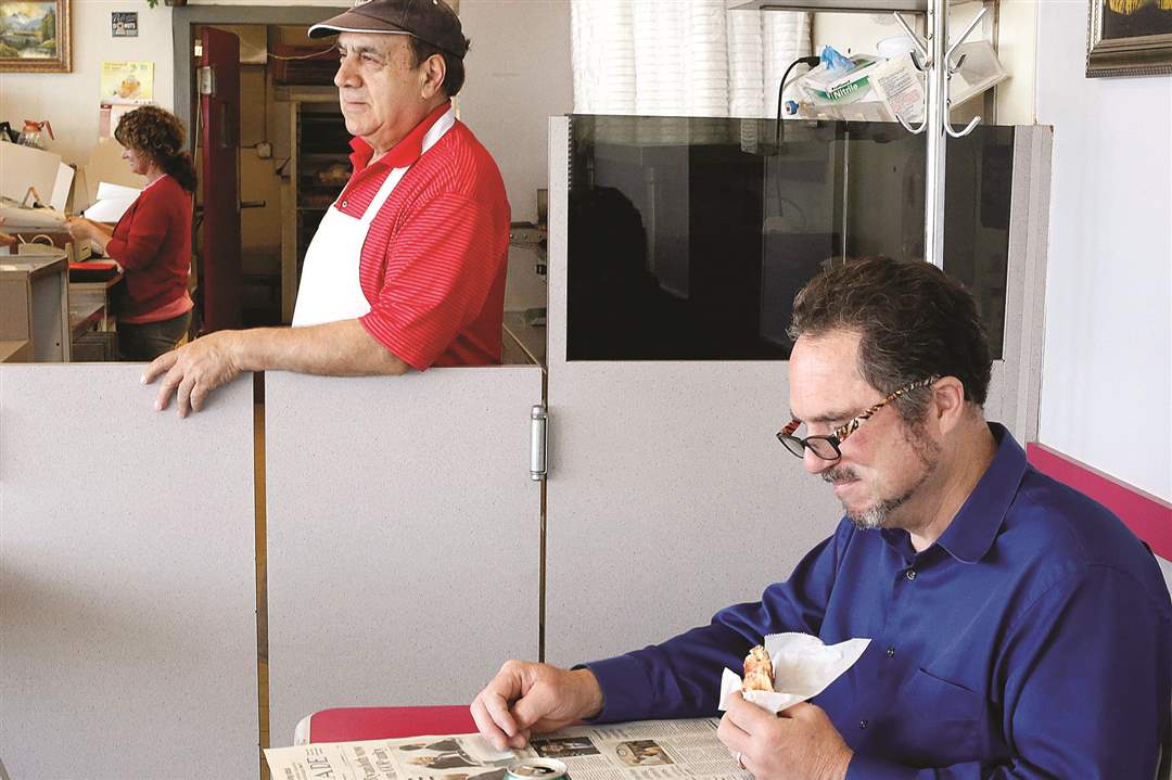 Bruce Tillotson, right, of Whitehouse, eats a doughnut while Bill Vogiatzis, center, and his wife Angie Vogiatzis, co-owners of Cafe Donuts, mind the shop.