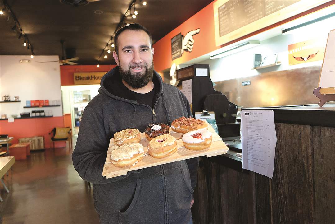 Chris Ritter, of Holey Toledough, with his doughnuts. He makes a different variety each week. Doughnuts included Blueberry cheese cake, cookies n' cream, and a pecan streusel Persian doughnut.