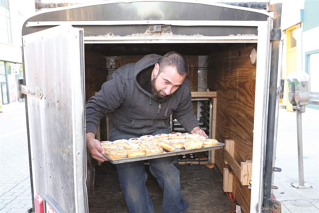 Chris Ritter of Holey Toledough carries a tray of doughnuts out of his trailer. He delivers doughnuts to several area businesses.
