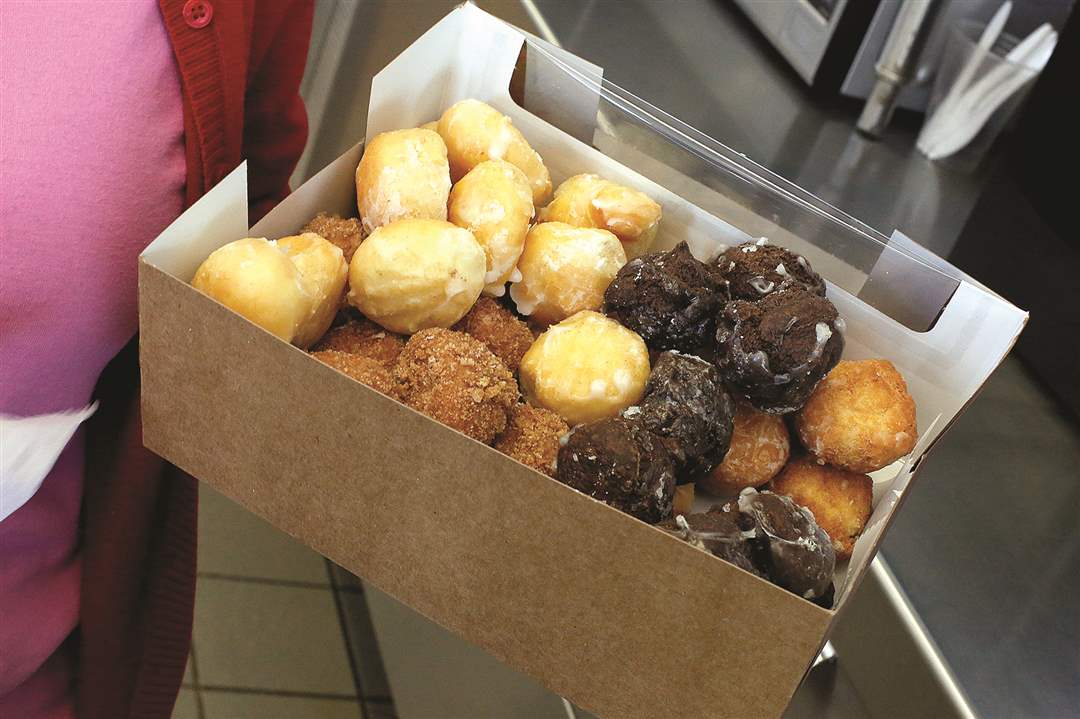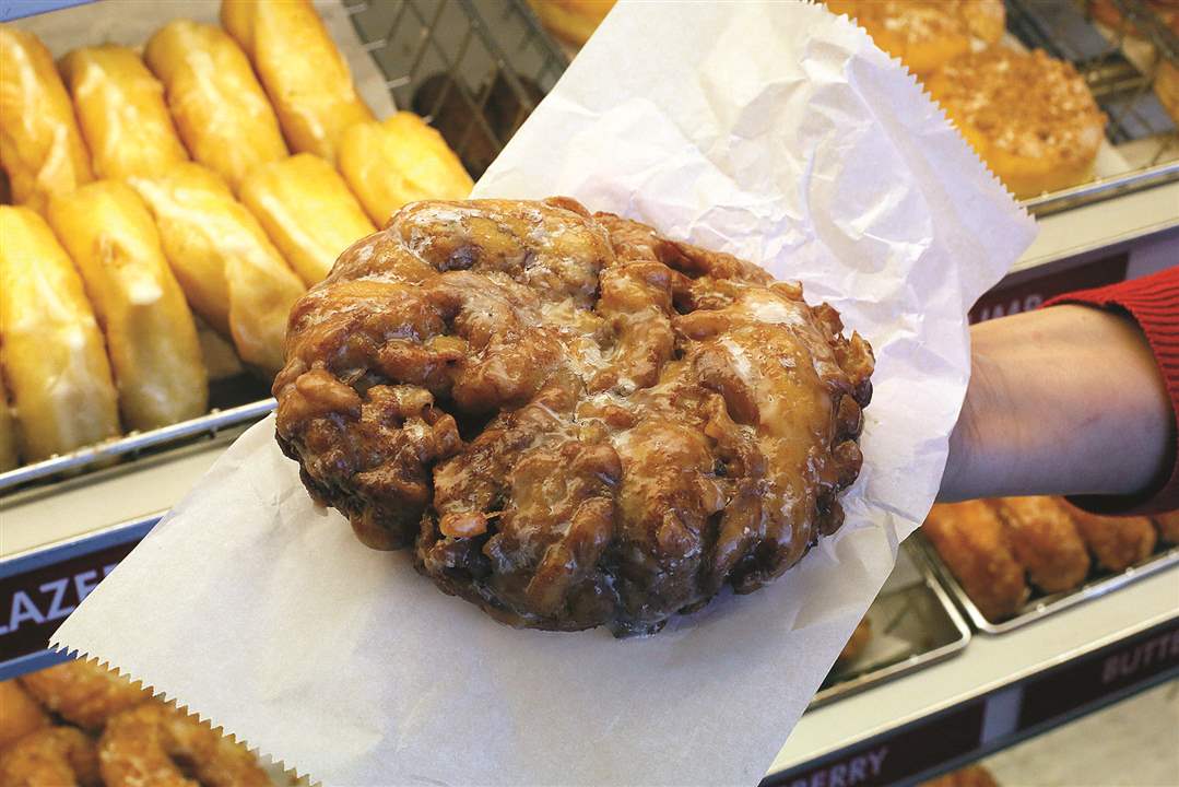 Angie Vogiatzis, co-owner of Cafe Donuts, serves an apple fritter at her doughnut shop.