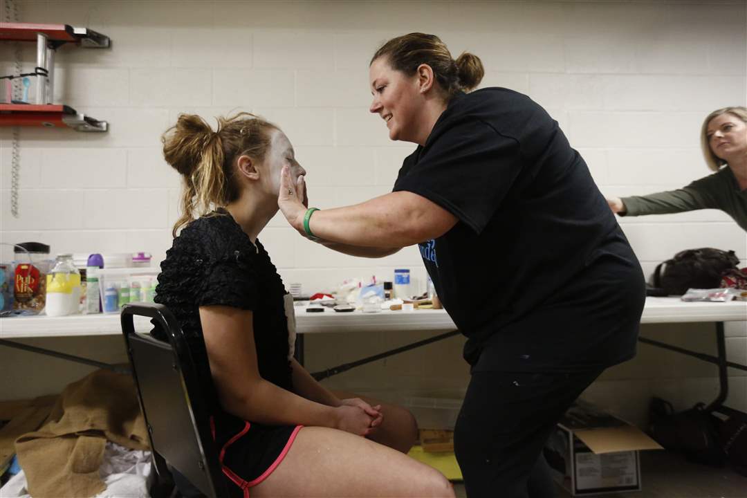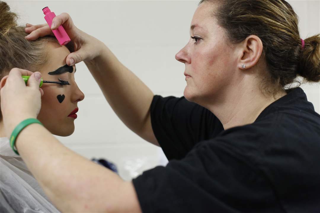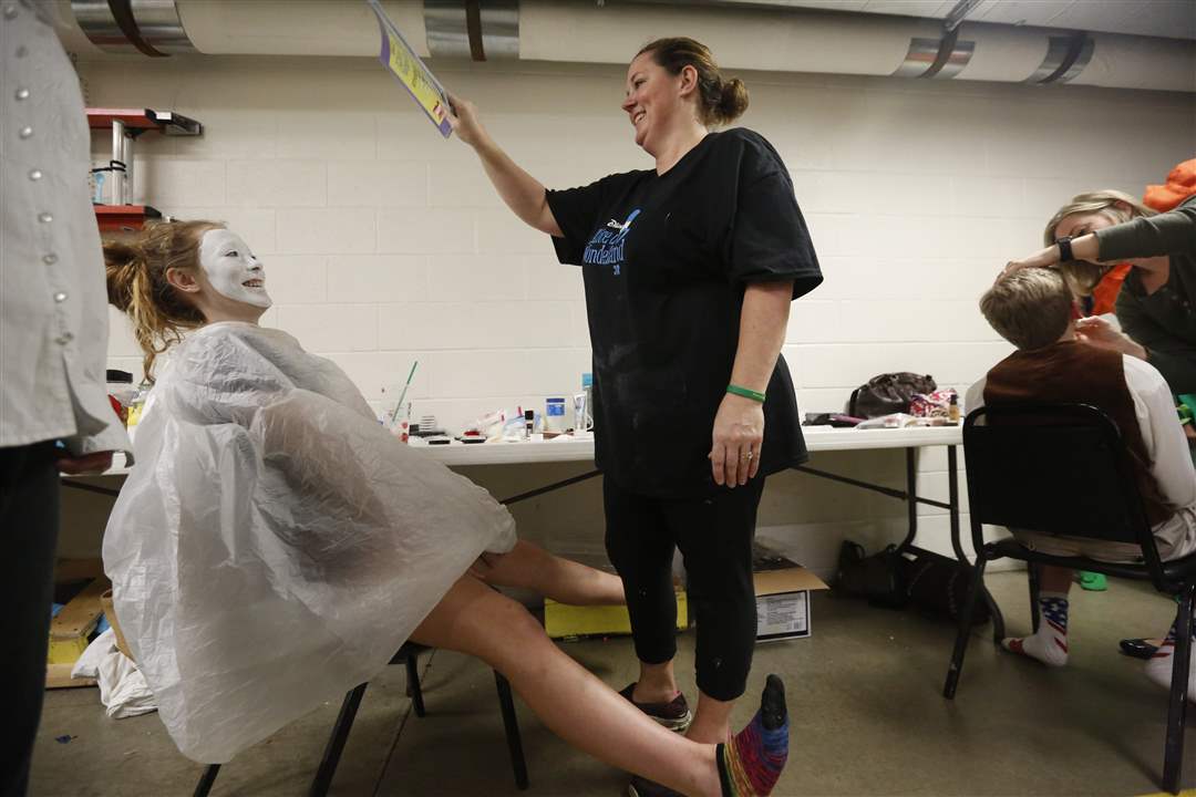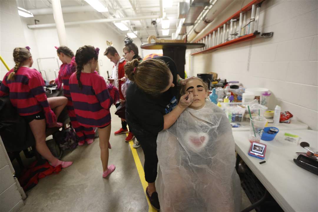 Olivia "Birdie" Olsen, 13, right has her make-up put on by her mother Deanna Olsen, left, for her debut as the Queen of Hearts in St. Patrick of Heatherdowns School's performance of Alice in Wonderland in the Maumee Indoor Theatre on March 30.