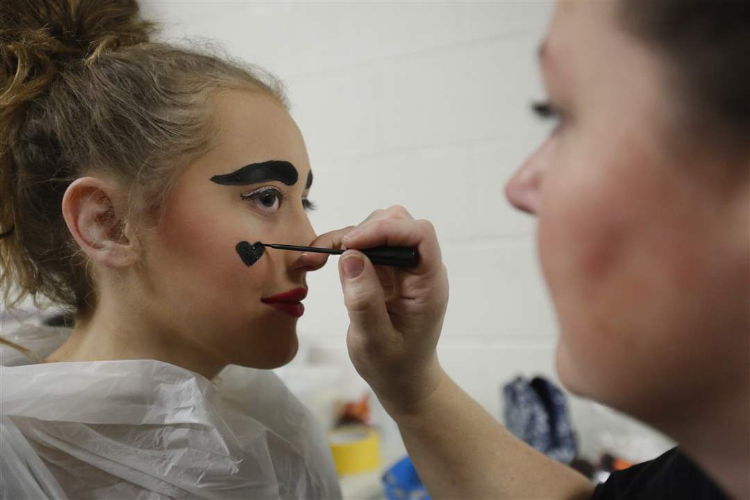 Olivia "Birdie" Olsen, 13, left, has a heart painted on her face by her mother Deanna Olsen, right, for her debut as the Queen of Hearts in St. Patrick of Heatherdowns School's performance of Alice in Wonderland in the Maumee Indoor Theatre on March 30.