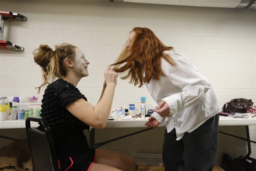 Olivia "Birdie" Olsen, 13, left, laughs with her friend Lexi Lewinski, right, 14, while backstage for St. Patrick of Heatherdowns School's performance of Alice in Wonderland in the Maumee Indoor Theatre on March 30.