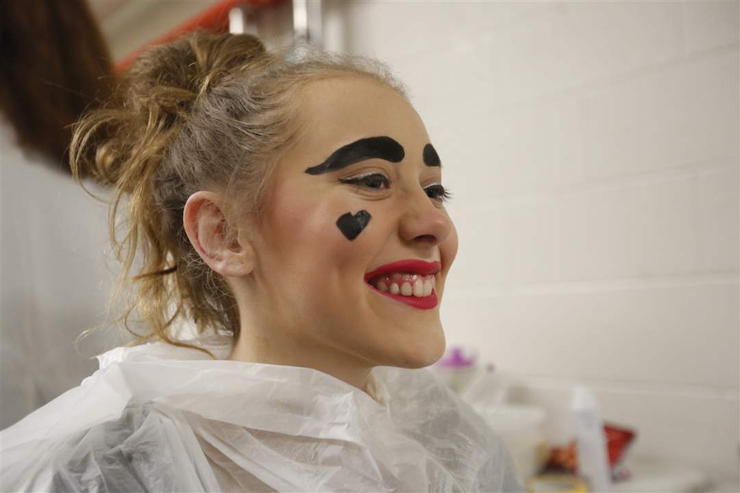 Olivia "Birdie" Olsen, 13, flashes a big smile after a heart was painted on her face for her debut as the Queen of Hearts in St. Patrick of Heatherdowns School's performance of Alice in Wonderland in the Maumee Indoor Theatre on March 30.