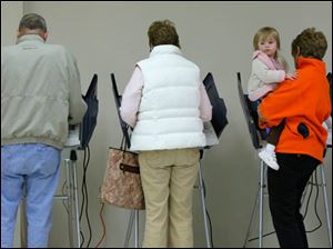 Nancy Rank holds her 22-month old great-granddaughter Quinn O'Connor as she casts her ballot at Our Lady of Perpetual Hope in South Toledo.