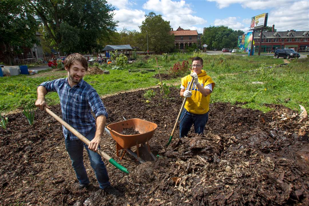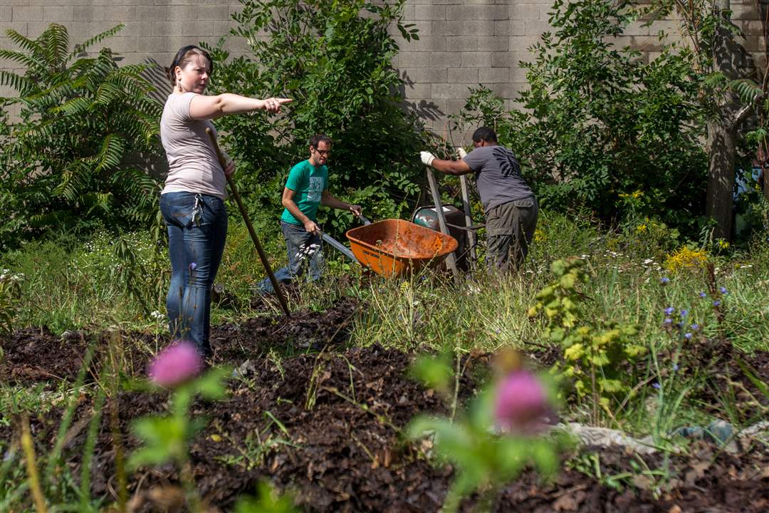 Volunteers from left, Colleen Eldridge of Toledo, leader Nick Botek, and Adren Burkes of Toledo work at the community garden.