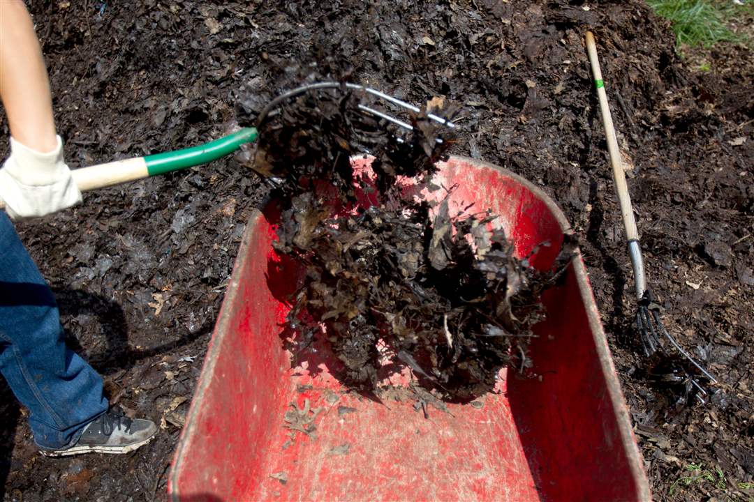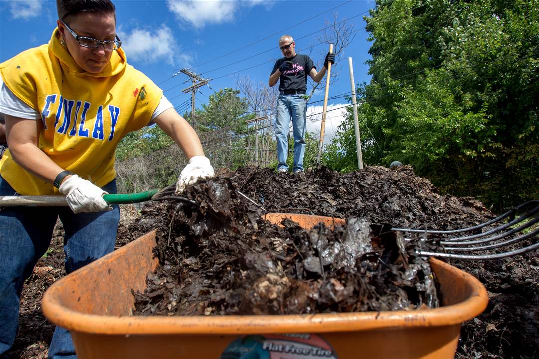 Colleen Eldridge of Toledo, right, unloads a cart of leaves and mulch.