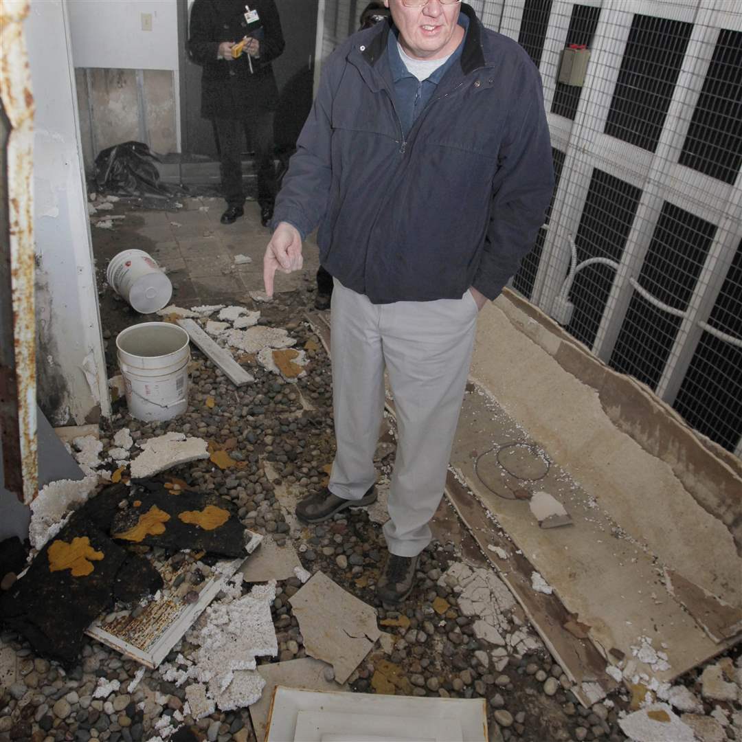 Wood County building official Michael Rudey shines a flashlight at a hole in the ceiling, which has resulted in black mold on the walls, during inspection of Woodville Mall.