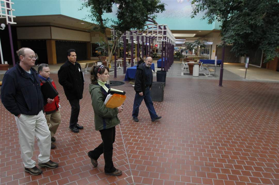 Northwood building and fire officials inspect the Woodville Mall. From left: Brad Espen, director of Environmental Health for Wood County; City of Northwood administrator Dennis Recker; Wood County building official Michael Rudey; Northwood zoning inspector Kimberly Grames; and the mall operations director.