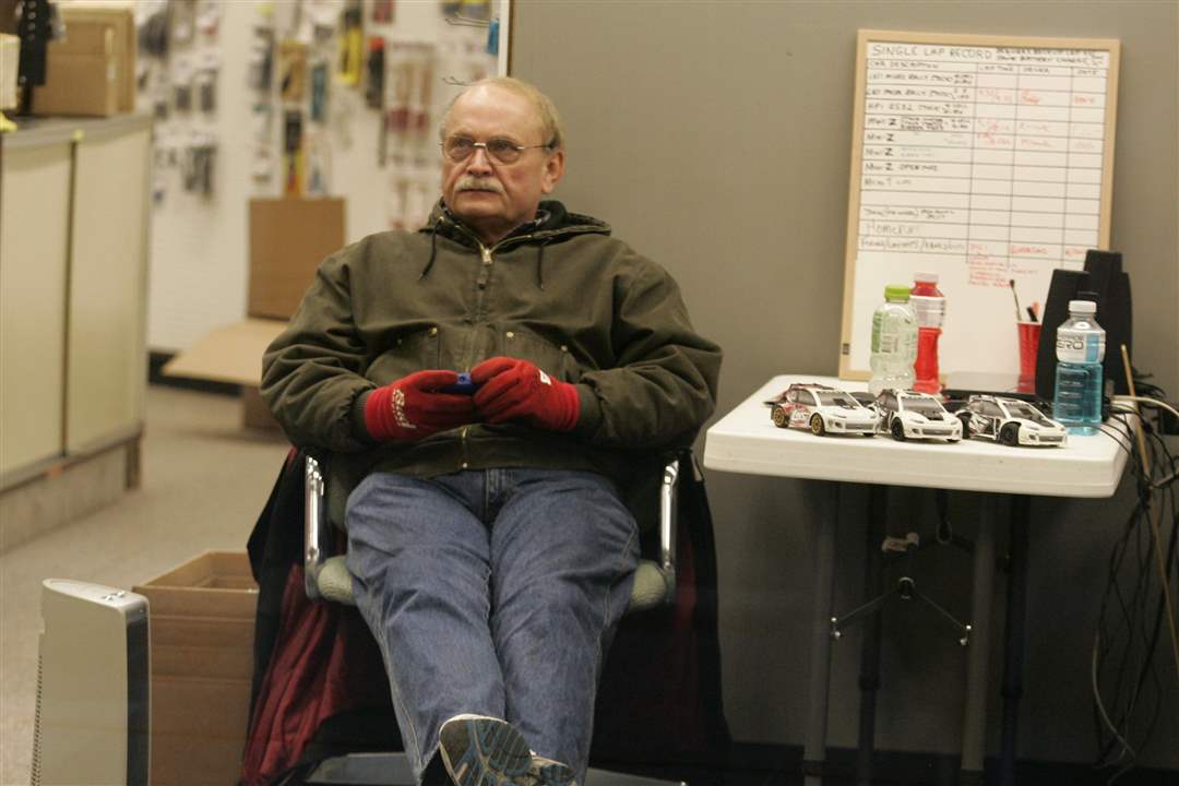 Billy Clark hangs wears gloves and sits by a space heater at Hobby Outfitters inside the Woodville Mall in Northwood. The persistent cold inside the mall from a lack of heat, which has been a source of numerous complaints.