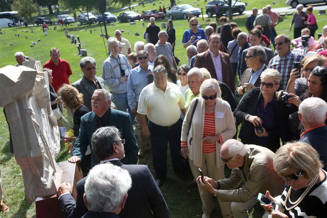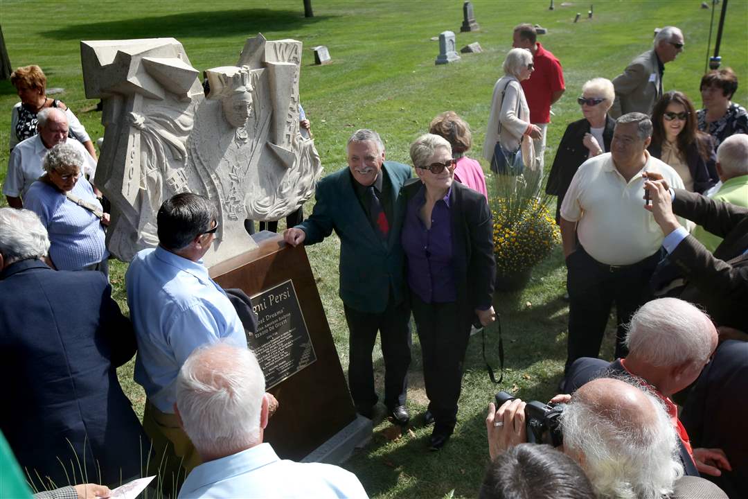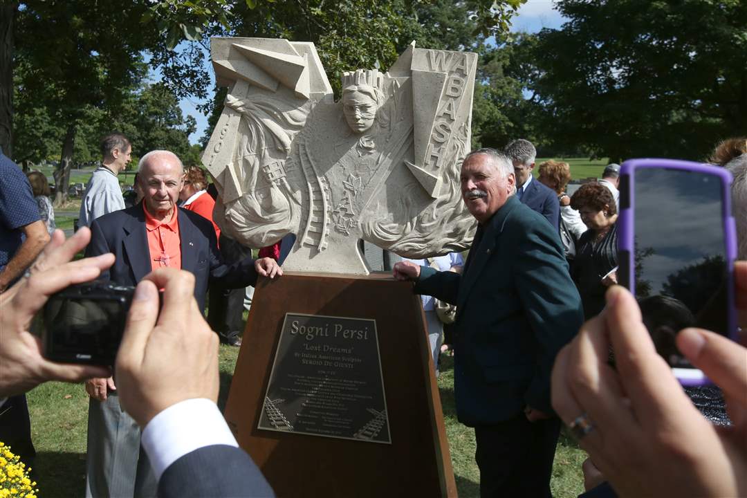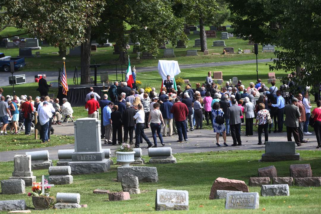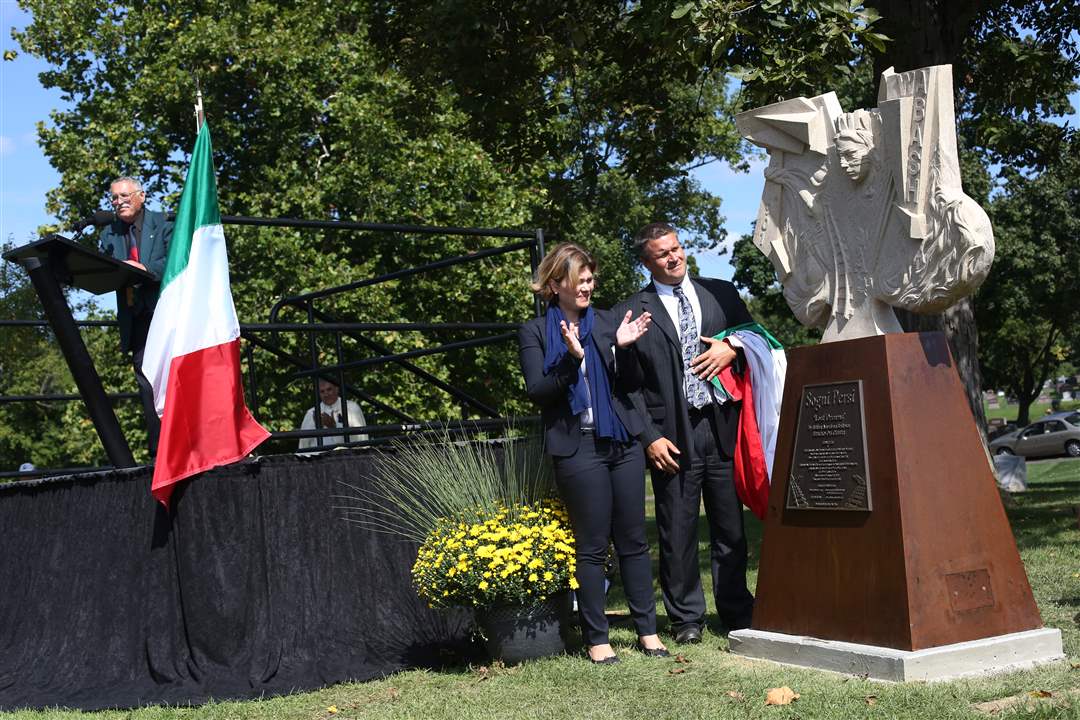 Artist Sergio de Giusti, center left, stands with his newly unveiled sculpture as attendees crowd in after the Italian-American Memorial service.