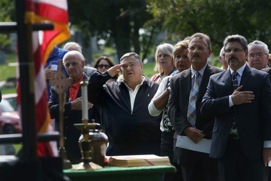 Vietnam veteran Lorenzo Garrisi of McComb Township in Michigan, center left, salutes the flag as the U.S. national plays after the national anthem of Italy during Italian-American Memorial service held to commemorate the wreck of the Wabash.