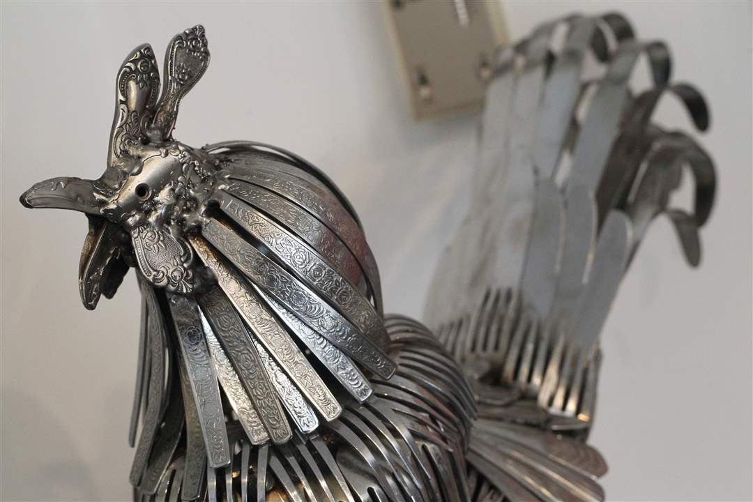 Silverware patterns are visible in the feet of Gary Hovey's creation, "Something to Crow About."