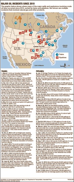 Major incidents involving trains include one March 7, when a 94-car Canadian National Railway crude oil train derailed three miles outside the northern Ontario town of Gogama, and another two days earlier in which 21 cars of a 105-car BNSF Railway train hauling oil from the Bakken region of North Dakota derailed about three miles outside Galena, Ill.