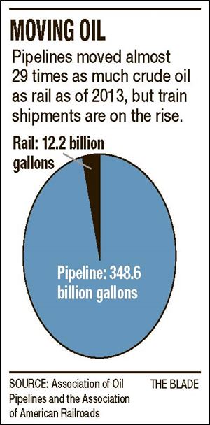 In 2013, America moved 8.3 billion barrels (348.6 billion gallons) of crude oil via pipeline — nearly 29 times the 291 million barrels (12.2 billion gallons) moved by rail, according to figures from the Association of Oil Pipelines and the Association of American Railroads.